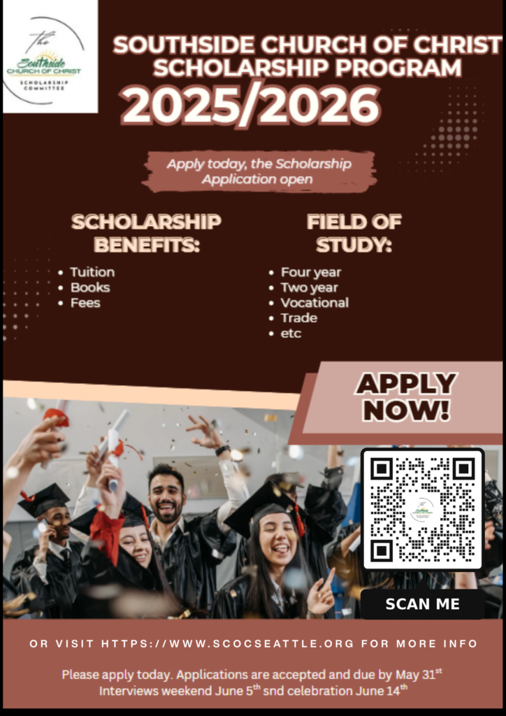 Southside Church of Christ is absolutely thrilled to kick off the application season for our annual Higher Education Scholarships for the Academic School Year 2026/2027!